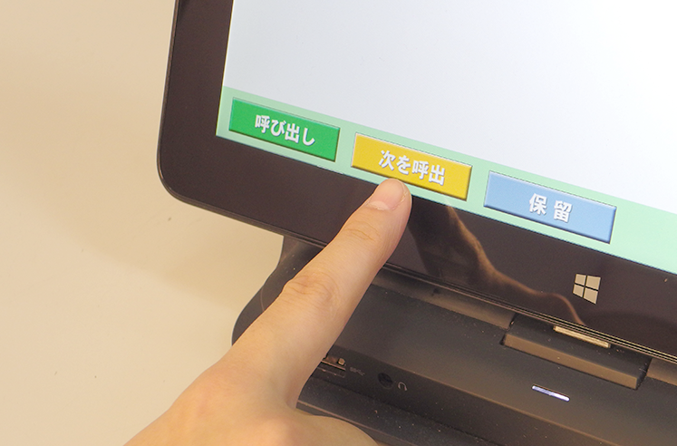 患者様を受付順通りに呼び出す場合、次を呼出ボタンにタッチするだけです。選択した患者様の呼び出しや、検査などに行かれた患者様の保留など、必要最低限の機能がわかりやすく備わっていて、スムーズに、業務を進めることができ、患者様へのサービスの向上にも役だっています。